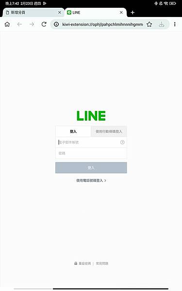 設定好《Kiwi Browser》瀏覽器的「LINE」擴充功能後,回到分頁重新點選設定按鈕,這時候你可以在列表最下方找到「LINE」擴充功能選項,點擊後就能進入 LINE 的登入畫面,這部分登入操作與電腦版差不多,看你是要帳號密碼登入還是掃描 QR Code,記得手機也要帶在身邊,因為這裡會需要輸入手機驗證碼。