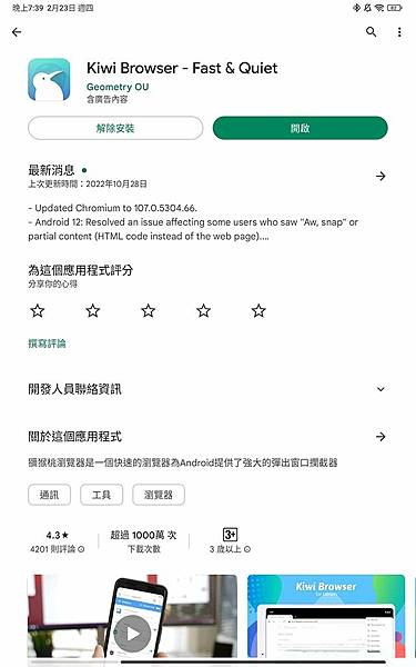 ▲Android 平板電腦用戶需要先從 Play 商店下載《 Kiwi Browser 》瀏覽器。