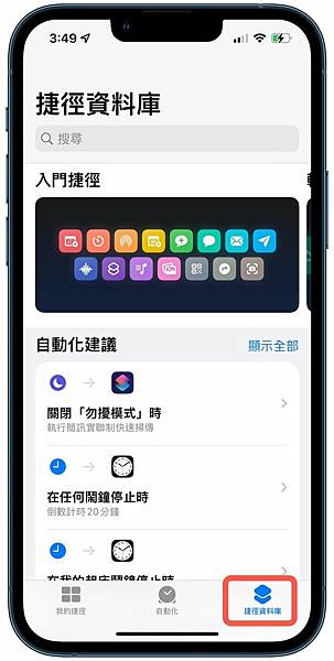 首先打開「捷徑」App 點選右下角「捷徑資料庫」